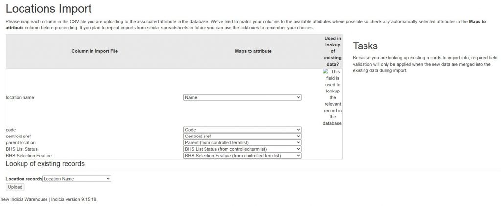 The second step involves matching file attributes to the location fields. Where you are updating an existing location the location name must match. Any location attributes can be updated in this manner, including custom attributes although they must exist prior to the import.