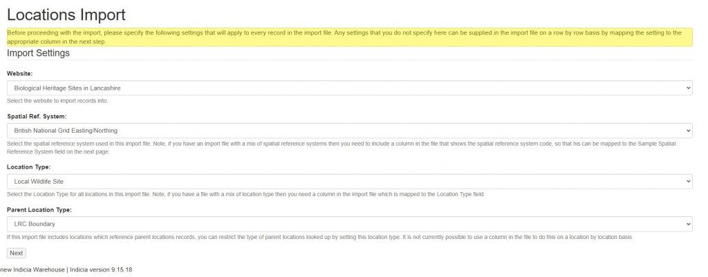 The first import step sets meta fields for the import. These include the Website, Spatial Reference System, Location Type, and Parent Location Type. Note that the Location Type can be overridden in the file attributes where you have a mix of location types.